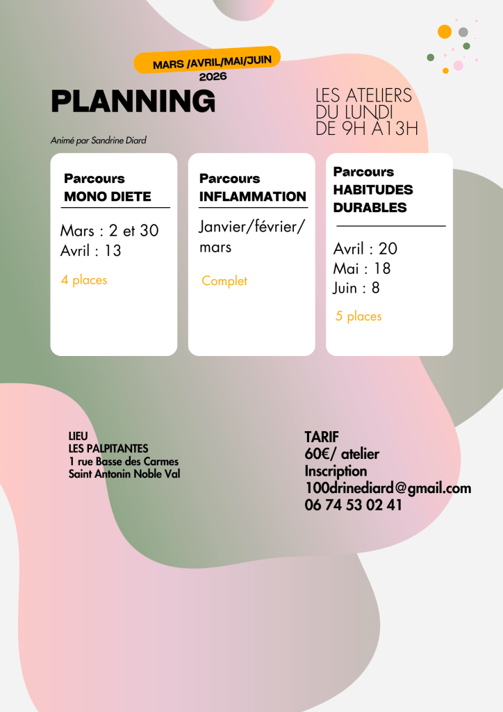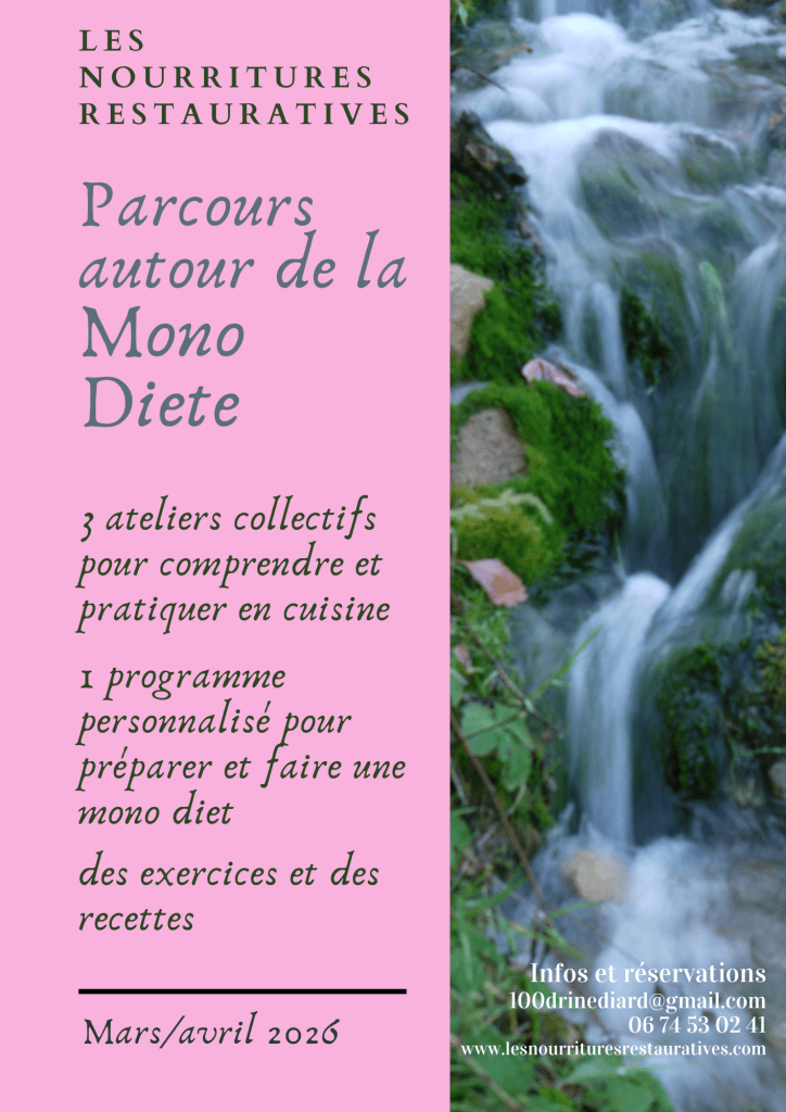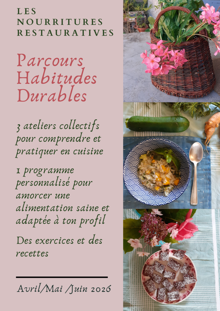 À travers des ateliers où nous pratiquons ensemble, je propose une approche de la nutrition adaptée aux saisons et aux besoins, en transmettant des manières de cuisiner, de goûter, de sentir ; des éléments pour comprendre et des repères pour l’appliquer dans votre quotidien.